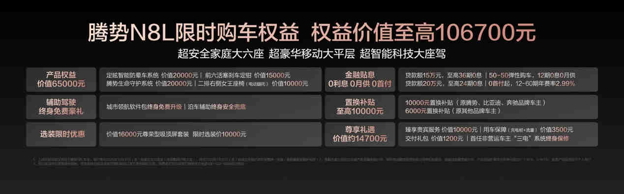 騰勢(shì)N8L售價(jià)為29.98萬元-32.98萬元,上市以來持續(xù)熱銷,為回饋用戶厚愛,推出限時(shí)購(gòu)車權(quán)益,價(jià)值最高達(dá)10.67萬元!包括價(jià)值1.7萬元的三年免息,最高1萬元的置換補(bǔ)貼。此外,在2025年11月30日24點(diǎn)前完成合同簽署的用戶,如果因非用戶原因車輛未及時(shí)交付,導(dǎo)致開票實(shí)際發(fā)生在2026年,可享受購(gòu)置稅差額補(bǔ)貼,最高1.5萬元!用戶不必?fù)?dān)心因?yàn)榻卉囃?,而享受不到?gòu)置稅補(bǔ)貼。