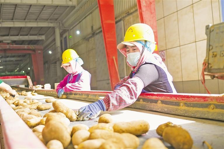 在農業產業化國家重點龍頭企業——雪川六盤山食品(寧夏)有限公司的智能化生產車間里,原州區中河鄉硝口村村民馬存花熟練地挑揀著傳送帶上的馬鈴薯。