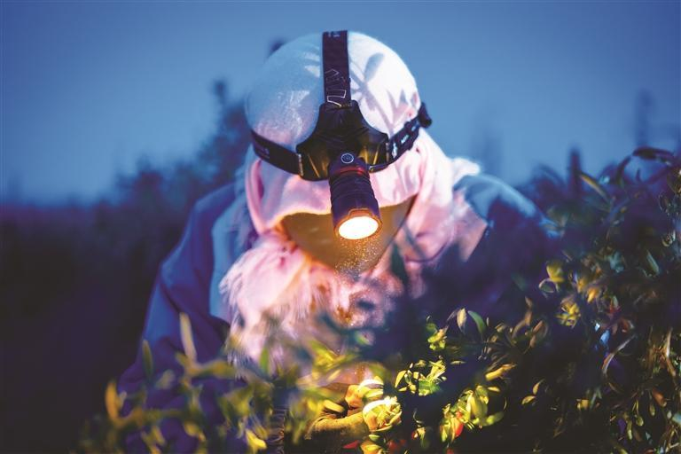 同心縣石喇叭村的農戶凌晨采收枸杞鮮果。