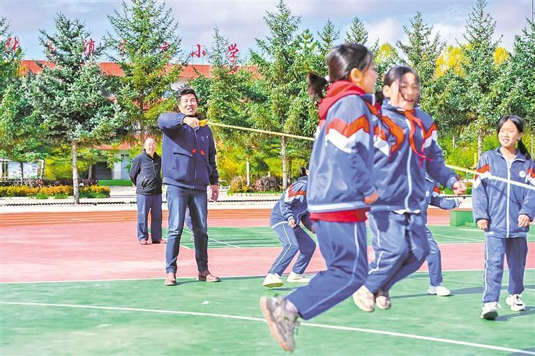 10月14日,在張易鎮紅莊小學的操場上,五年級的小羅與同學們圍成一圈做游戲,徐磊焱跑到圈中間問:“你們還記得我不?”“記得,您是送我們書包的徐老師!”小羅搶著說。