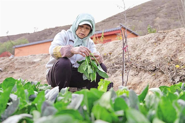 沈家河版畫創作者李麗榮在自家門前的菜地里摘菜。記者 郭小立 攝