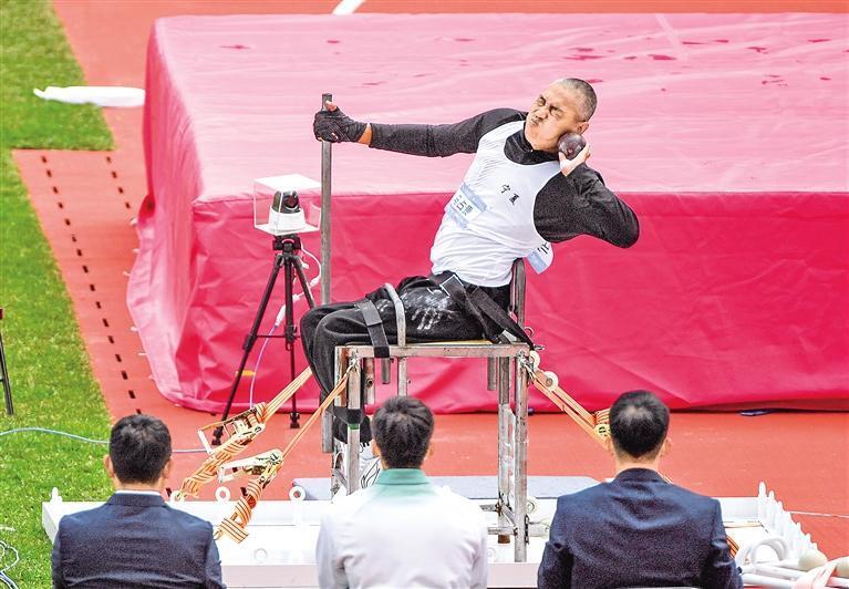 男子鉛球F52級決賽中,寧夏選手馬占貴以6.6米的成績奪冠。他坐在特制投擲架上,身體后傾蓄力、奮力擲出鉛球,動作連貫有力,贏得現場掌聲。