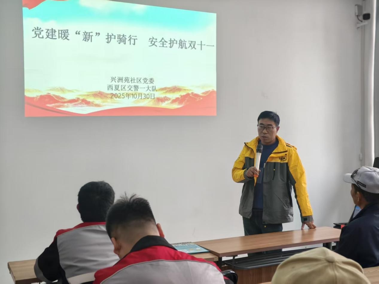 近日,銀川市西夏區西花園路街道興洲苑社區以黨建為引領,組織開展“黨建暖‘新’護騎行,安全護航雙十一”主題活動,邀請西夏區交警一大隊警官走進社區,把“安全課”“暖心禮”“健康服務”打包送到新就業群體身邊,讓新就業群體感受到黨組織的關懷與溫暖。