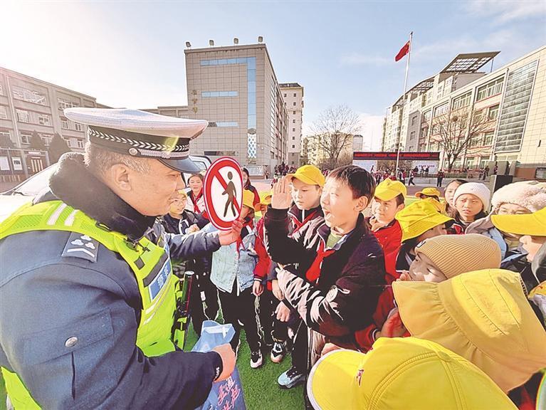 12月1日,銀川市興慶區第二小學,來自銀川市公安局交通管理局興慶區一大隊的警務人員給孩子們普及常見交通標識。連日來,全區各地圍繞“行走的交通安全課”開展形式多樣的主題活動,普及交通安全知識。記者 馬 楠 馬賽爾 攝