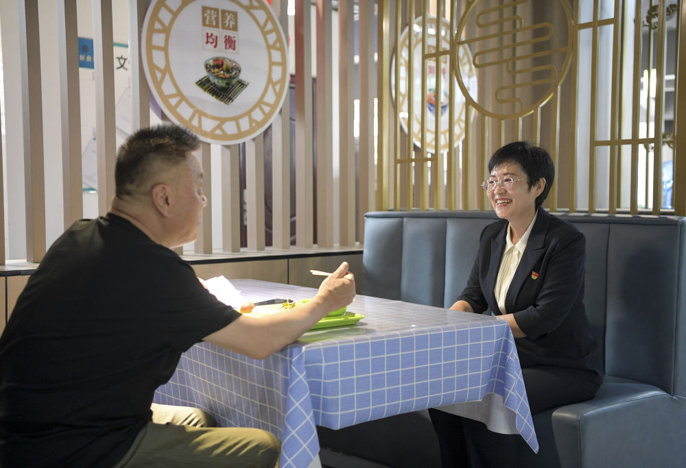 ??6月20日,寧夏銀川市金鳳區(qū)長城花園社區(qū)黨委書記趙耐香在社區(qū)日間照料中心了解食堂運(yùn)行情況。