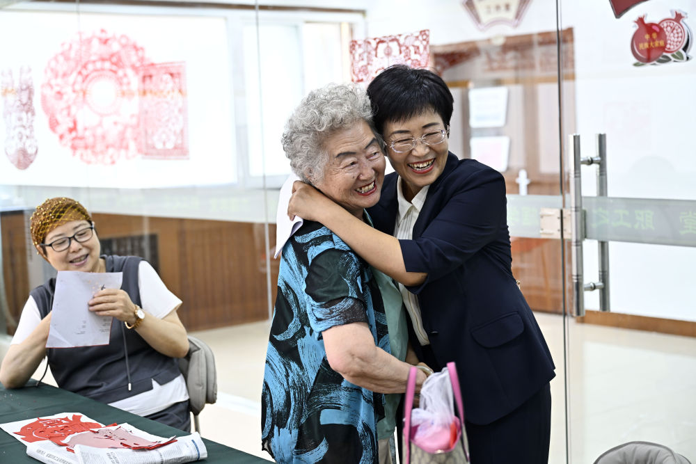 ??6月20日,寧夏銀川市金鳳區(qū)長城花園社區(qū)黨委書記趙耐香(右一)在社區(qū)“才藝堂”與居民交流。