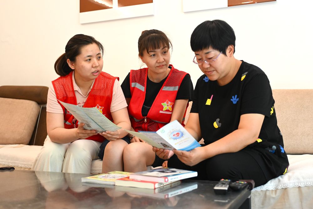 ??6月20日,寧夏銀川市金鳳區(qū)長城花園社區(qū)志愿者在入戶為居民提供服務(wù)。