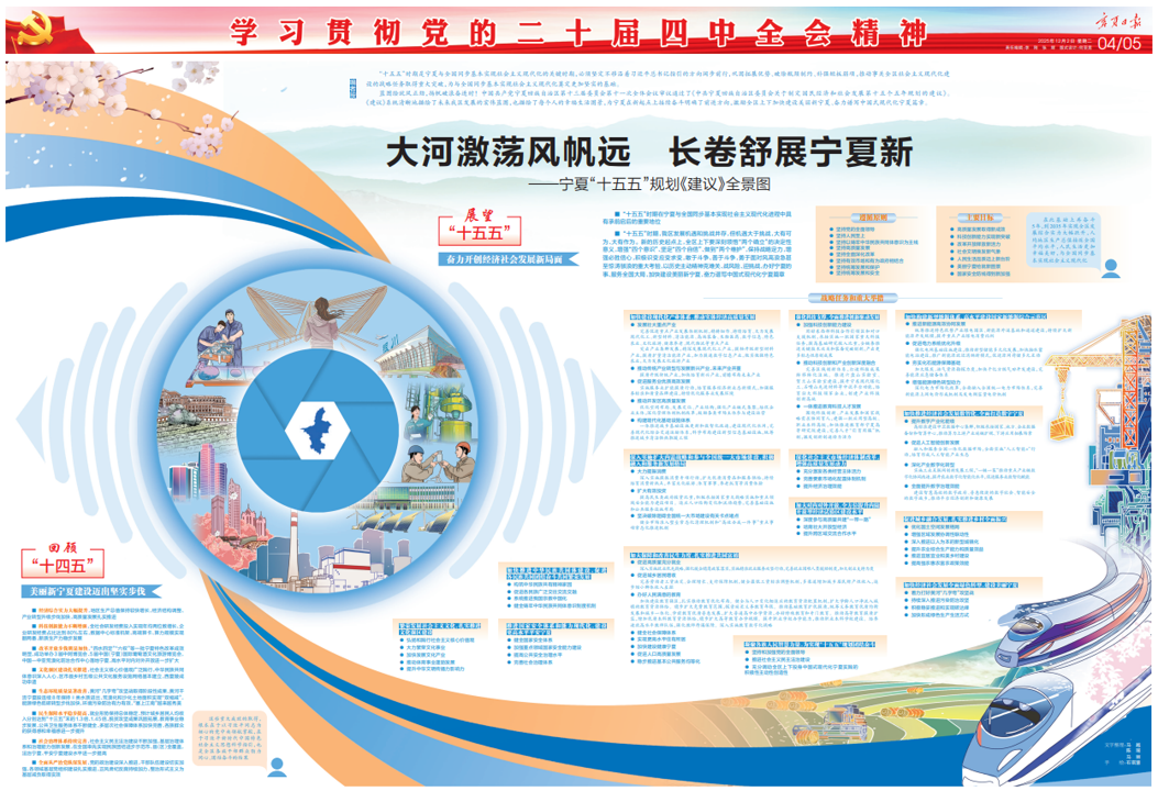 藍圖繪就風正勁,揚帆破浪奮進時!中國共產黨寧夏回族自治區第十三屆委員會第十一次全體會議審議通過了《中共寧夏回族自治區委員會關于制定國民經濟和社會發展第十五個五年規劃的建議》。《建議》系統清晰地描繪了未來我區發展的宏偉藍圖,也描繪了每個人的幸福生活圖景,為寧夏在新起點上接續奮斗明確了前進方向,激勵全區上下加快建設美麗新寧夏、奮力譜寫中國式現代化寧夏篇章。