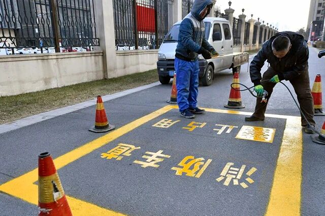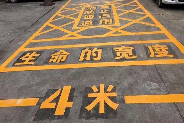 單位或者住宅區的消防車通道出入口路面,要按照消防車通道凈寬規劃禁停標線。標線為黃色網狀實線,外邊框線寬20厘米,內部網格線寬10厘米,內部網格線與外邊框夾角45度,標線中央位置沿行車方向標注內容為“消防車道 禁止占用”的警示字樣。在消防車通道兩側還要設置醒目的警示牌,提示嚴禁占用消防車通道,違者將承擔相應的法律責任等內容。